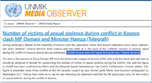 « ..Në Kosovë ka lista dhe peticione të supozuara se 20.000 gra kanë raportuar se janë përdhunuar gjatë vitit 1999 në Kosovë”, thotë Daçiq. (na Kosovu već postoje navodni spiskovi i peticije da je 20.000 žena prijavilo da je silovano za vreme 1999. na Kosovu », kaže Dačić.), kane raportuar mediat serbe, citon gazeta zvicerane në shqip Le Canton27.ch