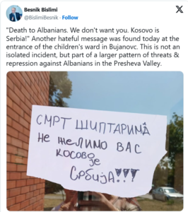« Vdekje shqiptarëve, nuk ju duam, Kosova është Serbi!’ Një tjetër mesazh urrejtës është gjetur sot në hyrje të repartit të fëmijëve në Bujanoc. Ky nuk është një incident i izoluar, por pjesë e një modeli më të madh kërcënimesh dhe represionesh kundër shqiptarëve në Luginën e Preshevës”, ka shkruar ai në X.