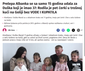 Një grua e bukur shqiptare u martua me Dushkon, i cili ishte 37 vjeç, në moshën 15 vjeç (Prelepa Albanka se sa samo 15 godina udala za Duška koji je imao 37: Rodila je pet ćerki u trošnoj kući bez vode i kuptalia) me ket ttull gazete serbe Blick ka srkuar se « Ajo lindi pesë vajza në një shtëpi të rrënuar pa ujë dhe banjo.. ». Bauar nga keto kshte ne Serbi, merre me mend cfare kushte dhe me te vèeshtira kjo vjaze shqipatre ka pasur ne Shqiperi?! E thash ketë, sepse njeriu e nëdrron vendin për te ndyrshuar ne dickame te mire, shkruan gazeta zvicerane në shqip LeCanton27.ch
