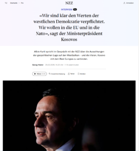 “Ne jemi qartësisht të përkushtuar ndaj vlerave të demokracisë perëndimore. Ne duam të bashkohemi me BE-në dhe NATO-n” («Wir sind klar den Werten der westlichen Demokratie verpflichtet. Wir wollen in die EU und in die Nato») sagt der Ministerpräsident Kosovos) thotë Kryeministri i Kosovës për gazeten zvicerane Neue Zürcher Zeitung, ction gazeza zvicane ne shqip LeCanton27.ch