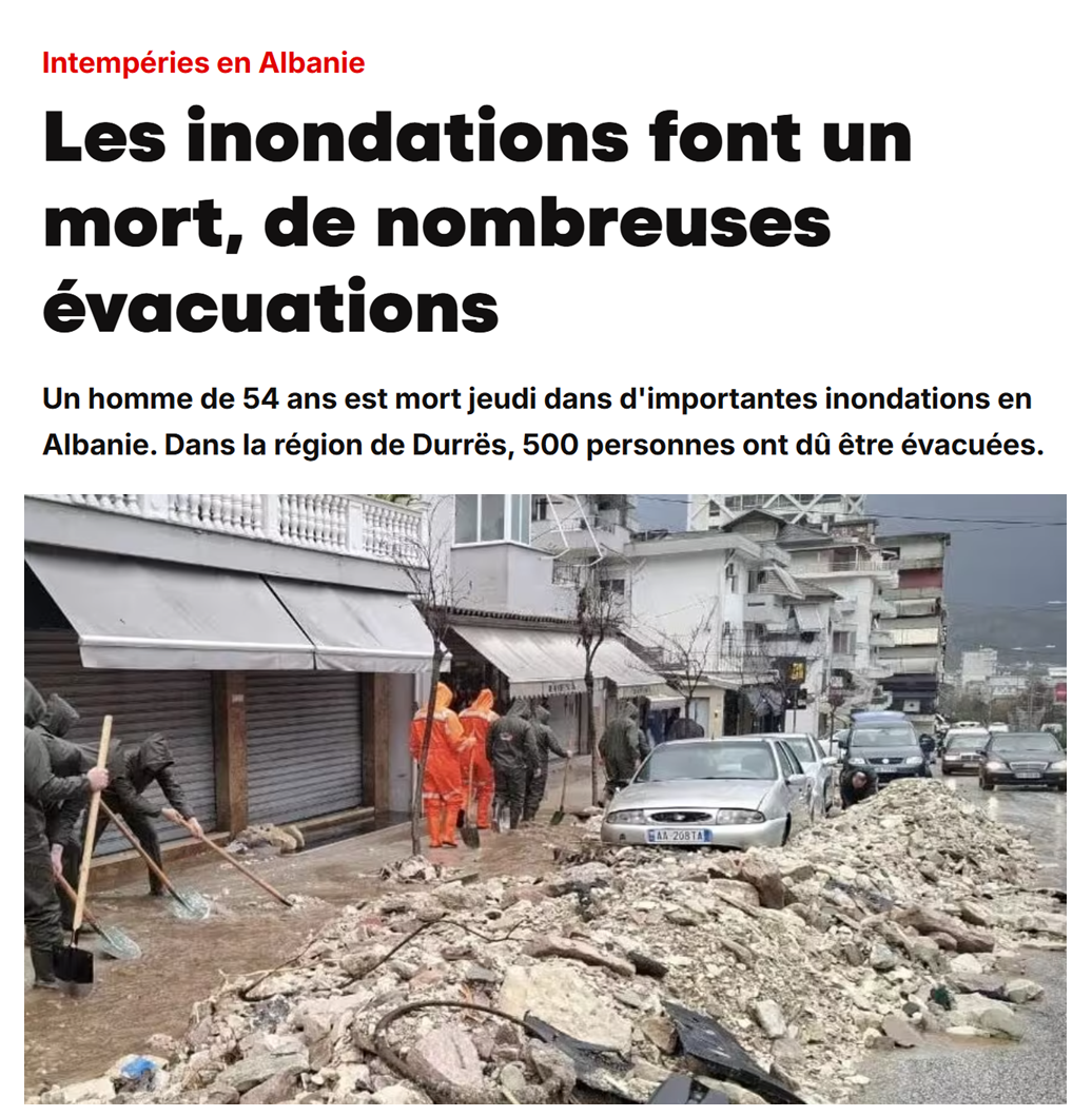 Një burrë 54-vjeçar vdiq të enjten në përmbytje të mëdha në Shqipëri. Në rajonin e Durrsit, 500 persona u detyruan të evakuoheshin, sjkran gazet prestigjioze Blick.ch, transmeton gazeta zvcerane ne shqip LeCanton27.ch