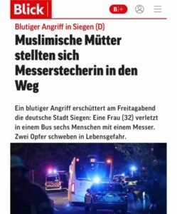 Bernë, 4 shtator -Javën qe e lam pas mediat evropiane, kryesisht ato gjermane dhe zvicerane u muaren me nje rast kriminal qe ndodhi ne Siegen (D) ku nje grua gjermane therri me thike 6 persona. Lidhur me këte mediat gjemane pushtuan mediat e tyre me tituj bombastik «Nënat muslimane heroina (Muslimische Mütter zu Heldinnen) evituan një tragjedi të madhe në Gjermani», tituj keta te cilet ndokujt nuk ju kanë pelqyer, për cka pasuan shumë reagime në rrjetet sociale për origjinën kombetare dhe fetare te grave shpetimtare.