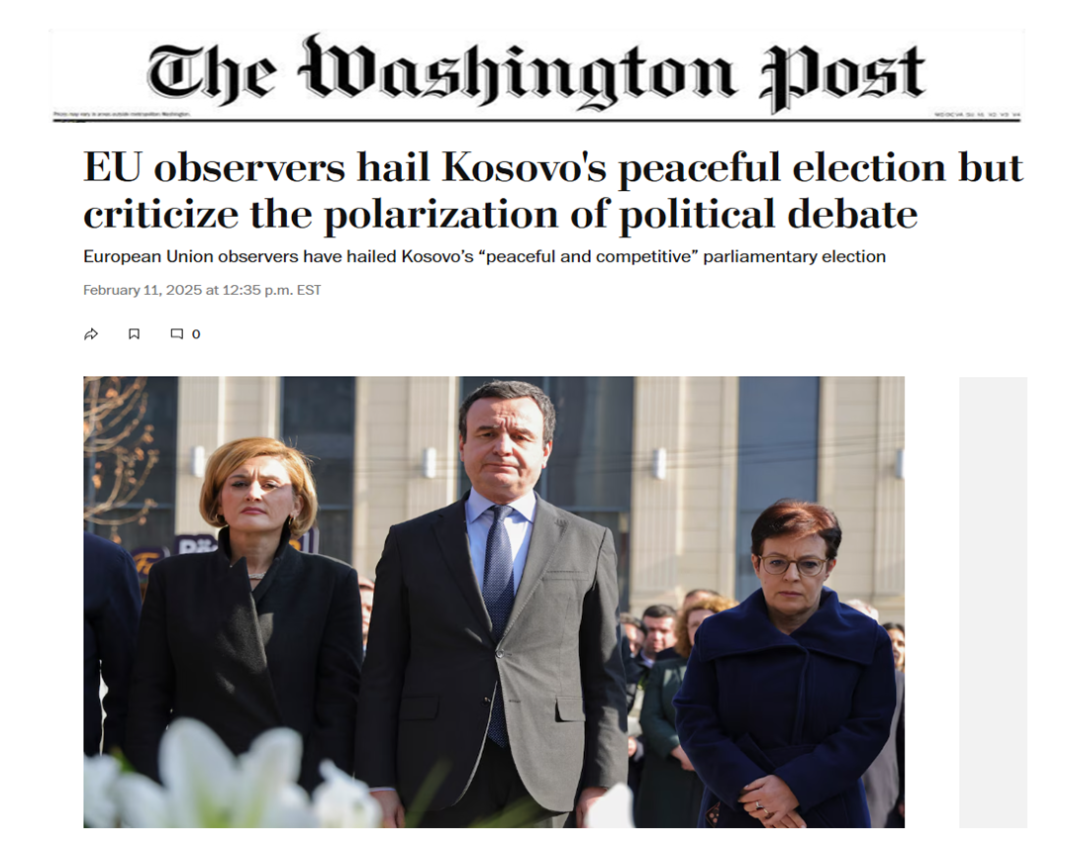 Uashington, 11 shkrut -« Vëzhguesit e BE-së përshëndesin zgjedhjet paqësore të Kosovës… »(EU observers hail Kosovo’s peaceful election) eshte ky titulli i gazetes prstigioze amerikane « Washington Post » e cila i konsideron zgjedhjet e sukseseshm ne Kosove te kurrorezuara me fitoren e liderit, kryeministrit te Kosoves Abin Kurtit. Vëzhguesit e Bashkimit Evropian kanë përshëndetur zgjedhjet parlamentare “paqësore dhe konkurruese” të Kosovës. Este kjo hera e dyte qe shkruna kjo gazete amwrikane per fitoren e z.Kurti, rapprton gazeta zvcierane en shqip LeCanton27.ch