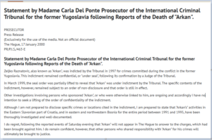 Deklaratë nga Zonja Carla Del Ponte, Prokurore e Tribunalit Ndërkombëtar Penal për ish-Jugosllavinë, pas Raporteve për Vdekjen e « Arkanit ».