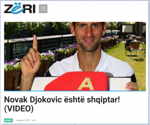 « Novak Djokovic është shqiptar! » kishte shkruar gazeta Zëri ( 31 janar 2017) kur kryeredaktore ishte Arbana Xharra ose portali tjeter “Si është e mundur që vëllai i Novak Djokovicit të ketë mbiemër shqiptar” (Telegrafi.com).Pra ihsin keto vetem disa tituj te gazetave shqiptare ne Kosovë dhe Shqiperi rreth Novak Djokovicit qe e bene shqitarë, pr cuditrisht as nga keto gazeta e askuhs nuk protestoi ketyre diteve për Djokon?! Se është nga Kosova dhe ehste rritur me buke Kosove e praon edhe vete Djukovic i cli per mediat serbe ka deklaruar me 13 korrik 2016 se jam « une jam nga Kosova » (Ђоковић: Ја сам Србин са Косова) citon gazeta zvicerane Le Canton27.ch