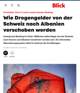 Bernë, 5 gusht -Një klan kriminal transferoi shuma të mëdha parash në Shqipëri dhe Kosovë nëpërmjet një agjencie udhëtimesh në Lucern.. Banka nëntokësore nën hetim: Dyshohet se miliona janë transferuar ilegalisht nga Zvicra në Kosovë dhe Shqipëri. Një sistem joformal transferimi është në qendër të hetimit, shkruan gazeta zvicerane në shqip LeCanton27.ch duke ju referuar burimeve te policise dhe mediumit Blick.ch.