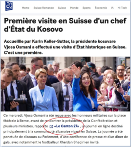 Bernë, 23 maj Presidentja e Kosovës, Vjosa Osmani, zhvilloi një vizitë zyrtare dy-ditore në Zvicër e pritur nga presidentja e Konfederates Helevetike znj.Karin Keller-Sutter. Ajo diskutoi me presidenten zvicerane për marrëdhëniet ekonomike dhe diplomatike, çështjet e sigurisë dhe migracionit, stabilitetin në Ballkanin Perëndimor dhe praninë zvicerane në Kosovë, e cila nganjëherë quhet « Kantoni i 27-të » nga gazeta zvicerane në gjuhën shqipe « Le Canton27.ch ».