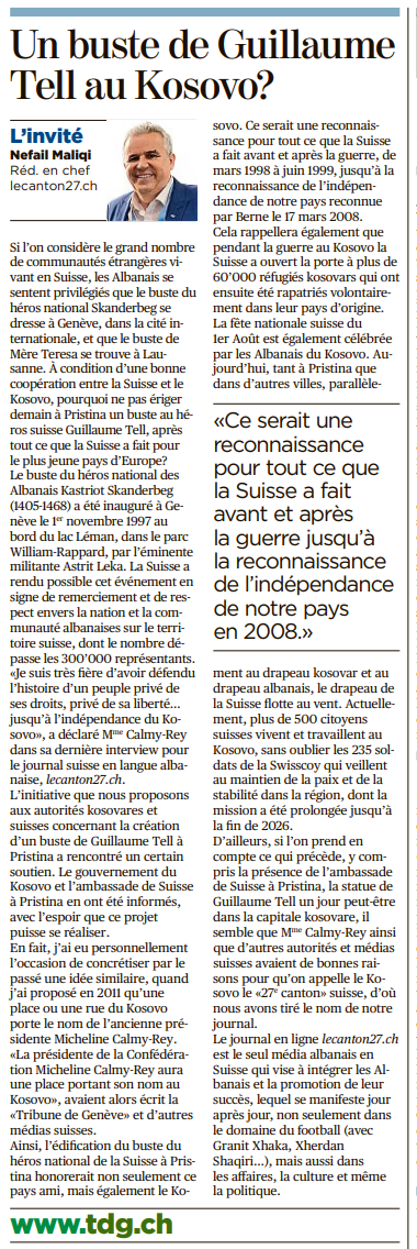 «Duke pasur parasysh numrin e madh të komuniteteve të huaja që jetojnë në Zvicër, shqiptarët ndihen të privilegjuar që busti i heroit kombëtar Skënderbeu qëndron në Gjenevë, në qytetin ndërkombëtar dhe që busti i Nënë Terezës ndodhet në Lozanë. Me kusht që të ketë bashkëpunim të mirë mes Zvicrës dhe Kosovës, pse të mos ngrihet nesër në Prishtinë një bust i heroit zviceran William Tell, pas gjithçkaje që Zvicra ka bërë për shtetin më të ri në Evropë?.. » ka shkruar ne fillim te artikullit (opinione) gazetari i njohur shqiptar ne Gjeneve Nefail Maliqi, redaktor i gazetes zvicerane ne shqip Le Canton27.ch. Kjo iniciative e gazetarit shqiptar nga Gjeneva eshte pershendetur dhe perkrahur nga autoritetet zvicerane dhe kosovare.