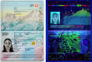 Seria e re e pasaportave kombinon sigurinë, funksionalitetin dhe estetikën. Ai bazohet në teknologjitë më të fundit në veçoritë e sigurisë për dokumentet e identitetit. Të dukshme herë me sy të lirë, herë nën rrezet UV, këto veçori sigurie e bëjnë pasaportën zvicerane një dokument të sigurt dhe unik.
