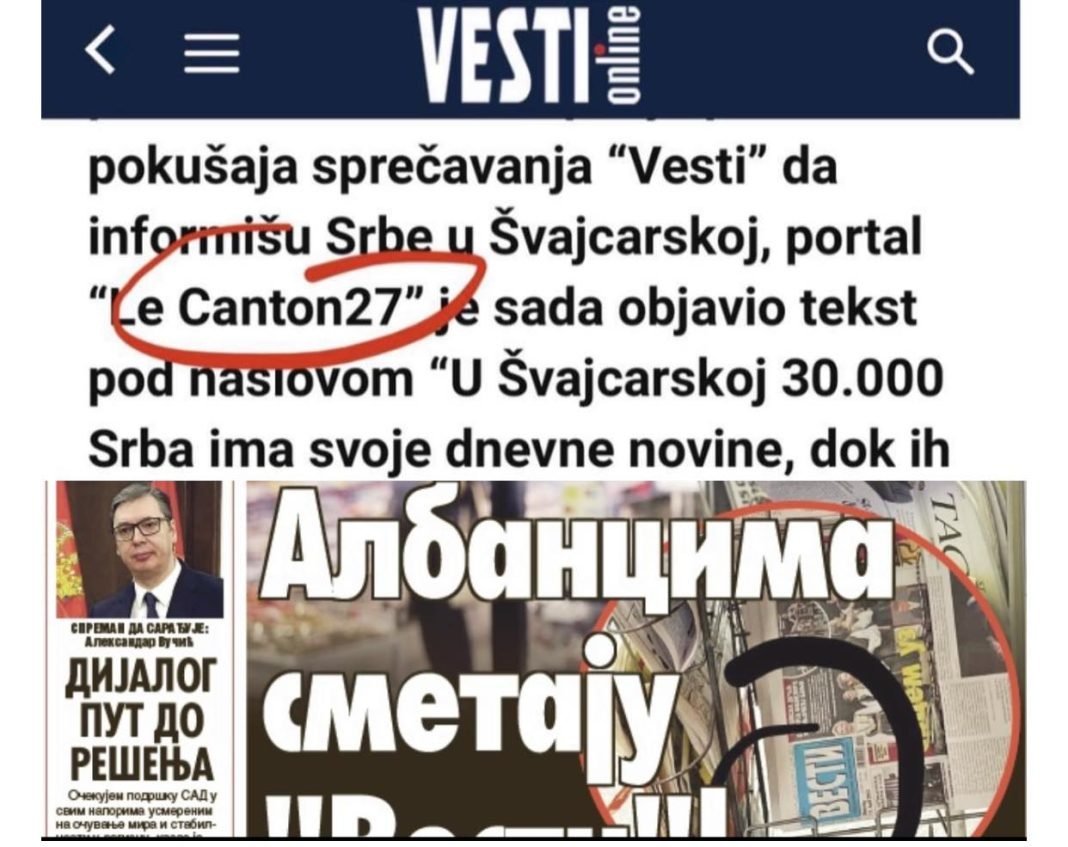 Mediat serbe paskan shkruar nder tjera se « gazeta serbe Vesti po i pengon shqiptarëve.. », ku shifet se paskan bere fushate dhe « patriot » ne emër te gaztes Le Canton27.ch, qe nuk eshte e vëretet sespe neve sio redaksi nuk na pengon nje gazete serbe ne Zvicer, por propaganda e tyre. Sepse ne Zvicer nuk jane 120.000 serbe. Ata jane, siq kemi shkruar, hiq me shume se 30 mije, po aq sa ka shqiptare vetem në një kanton, 26 sa jane në Zvicrës, pra aq sa shqipatre ka Gjeneva, Shkruan gazeta zvicerane ne shqip Le Canton27.ch