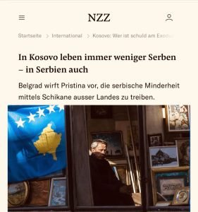 Ka gjithnjë e më pak serbë që jetojnë në Kosovë – dhe në Serbi gjithashtu (In Kosovo leben immer weniger Serben – in Serbien), eshte ky titulli ne numrin e sotem te gazetes prestigjioze te Zvicres Neue Zürcher Zeitung (NZZ) e cila ju ka referuar nje studimi evropian (Qendra Hulumtuese e Iniciativës Evropiane për Stabilitet – ESI), shkruan gazeta zvicerane Le Canton27.ch