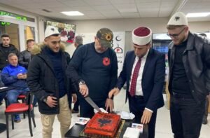Imami i xhamise « Dituria » ne Gjenevë Rijad Ef.Aliu me bashkepunëtorë duke prere « torten me flamur kuqezi » uroi 28 Nentorin komunitetin shqiptarë ne Kantonin e Gjeneves dhe mbare mërgmitareve në Zvicer