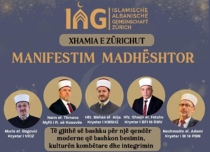 Cyrih, 26 janar -Mbrem ne Cyrih te Zvicres ehste roganizuar nje manifestim Madhështor “Të gjithë së bashku për një qendër moderne që bashkon besimin, kulturën kombëtare dhe integrimin” organizuar nga Xhamia e Zürichut. Imamet dhe mysfret përshendeten edhe Zvicren si nje vend i demokracise dhe tolerantë, model per vendet tjera ne bote. Ne ketë mbremje moren pjese elita e imameve dhe hoxhallareve nga toka shqiptare ne ballkan dhe njofton gazeta zvicerane në shqip LeCanton27.ch