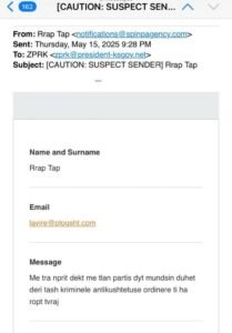 Osmani a été menacé par un e-mail envoyé à l’adresse e-mail officielle de la présidence. Sur la photo ci-dessous, vous pouvez voir le message envoyé à l’adresse e-mail de la Présidence :
