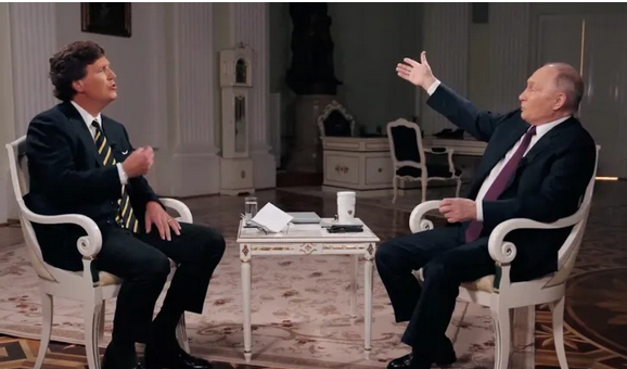 Carlson, ish-gazetar i Fox News, bëri emër duke përhapur teori konspiracioni dhe e ka vënë në pikëpyetje mbështetjen e SHBA-së për Ukrainën në luftën e saj kundër trupave pushtuese ruse. Kjo ishte intervista e parë e Putinit me një figurë të mediave perëndimore prej se Rusia e nisi pushtimin e Ukrainës në fillim të vitit 2022.