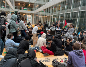 Sipas dëshmitarëve në terren, rreth dyzet studentë ishin ulur – ndonjëherë në divane – në qendër të sallës së Géopolis, ndërtesë e dedikuar për shkencat politike, shkencat sociale dhe gjeoshkencat mjedisore. Flamujt palestinezë janë përhapur në tokë, slogane të tilla si « Rroftë Palestina » jehojnë në të gjithë ndërtesën akademike. Në orën 18:30 ishin mbledhur rreth njëqind aktivistë.