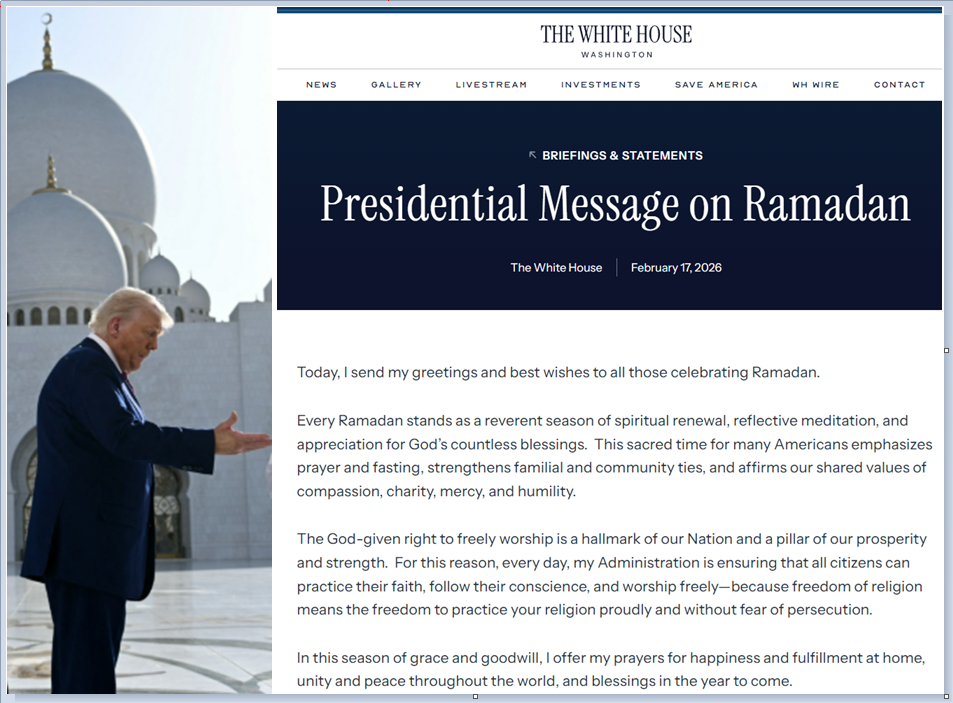 E drejta e dhënë nga Zoti për të adhuruar lirisht është një shenjë dalluese e Kombit tonë dhe një shtyllë e prosperitetit dhe forcës sonë. Për këtë arsye, çdo ditë, Administrata ime po siguron që të gjithë qytetarët të mund të praktikojnë besimin e tyre, të ndjekin ndërgjegjen e tyre dhe të adhurojnë lirisht – sepse liria e fesë do të thotë liria për të praktikuar fenë tuaj me krenari dhe pa frikë nga persekutimi.