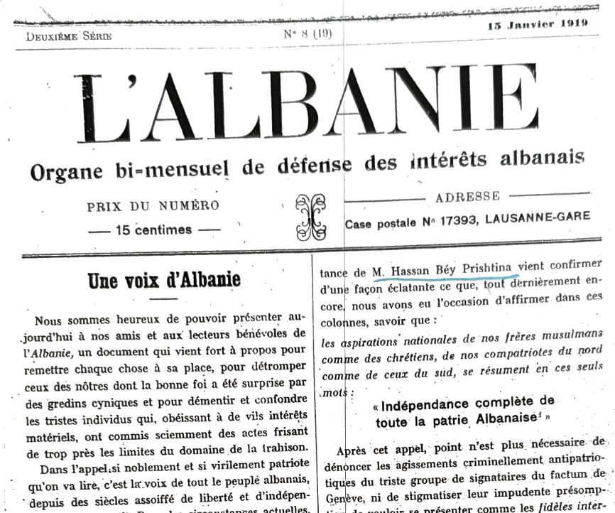 Dëshirat e vërteta dhe aspiratat legjitime të popullit shqiptar shpallen këtu dhe paraqiten qartë e pa asnjë mëdyshje, sepse këto dëshira dhe këto aspirata mbështeten, deri në hollësitë më të vogla, mbi të drejtat e patjetërsueshme dhe të pacenueshme të popujve, ashtu siç i proklamonte me aq vendosmëri dhe autoritet Presidenti Uillson. Ne ende e ndiejmë ndjenjën legjitime të sadisfaksionit patriotik, për faktin se sot kemi mundësi t’u ofrojmë atyre që kanë ende dyshime, dëshmi të pakundërshtueshme, ajo që kemi mbrojtur vazhdimisht në faqet e botimit tonë modest përputhet pikë për pikë me ndjenjat autentike dhe reale të popullit tonë, sepse çdo fjalë e z. Hasan bej Prishtinës vërteton qartësisht atë që ne, madje kohët e fundit shumë shpesh, kemi mundësi ta vërtetojmë përmes këtyre rreshtave, e kjo është: “Pavarësi e plotë për mbarë atdheun shqiptar”.
