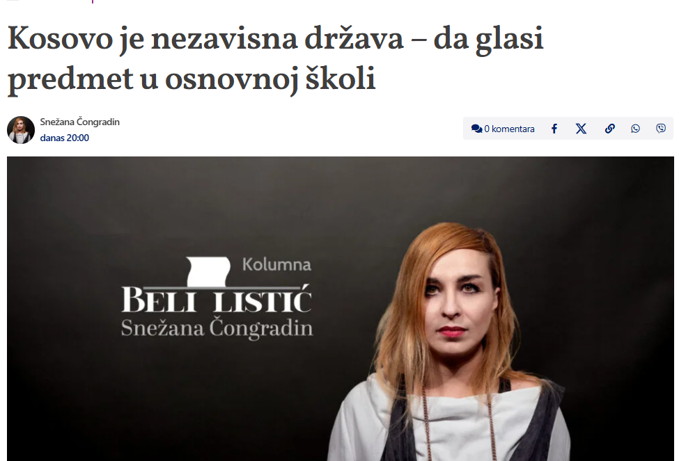 Kosova është shtet i pavarur. Kjo është fjalia që, duke pasur parasysh shkallën e verbërisë së njerëzve, duhet të quhet lëndë në shkollën fillore. Në vend që materiali të bazohej në propagandën e një politike kriminale lufte. Politikat e Aleksandar Vuçiqit, Vojisllav Sheshelit, Ivica Daçiqit, Sllobodan Millosheviqit dhe të gjithë shërbimit sekret, vrasësve, kriminelëve dhe hajdutëve janë të përfaqësuara edhe sot në media, shkolla, në politikën e kulturës dhe arsimit… Që në Serbi ka vazhduar. pa ndalur për më shumë se tridhjetë vjet.