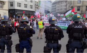 Disa qindra protestues u mblodhën në periferi të finales së Festivalit të Këngës në Eurovision të shtunën në qytetin zviceran të Bazelit për të denoncuar pjesëmarrjen e Izraelit në këtë konkurs, mes ofensivës së vazhdueshme izraelite në Gaza.