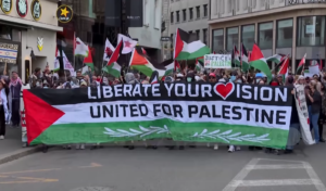 Duke mbajtur flamuj të shumtë palestinezë, demonstruesit ishin mbledhur pas një banderole të madhe horizontale ku shkruhej « Të Bashkuar për Palestinën » dhe një shfaqjeje në Eurovision: « Çlironi vizionin tuaj » me një zemër në vend të shkronjës v. (Çlironi vizionin tuaj). Ata dogjën një flamur izraelit dhe një flamur amerikan. Një pankartë shkruante: “Duke kënduar ndërsa Gaza digjet”. U shpërthyen edhe bomba tymi me ngjyrë jeshile.